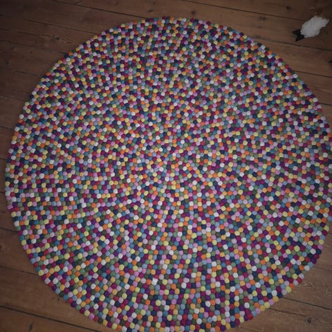 Hay rundt tæppe i uld med kugleformet struktur. Tæppet er flerfarvet med blandt andet orange, lilla og gule nuancer. Egnet som gulvtæppe i fx stue, entre eller børneværelse. Designet er rundt og ligger fladt på gulvet. Velegnet til brug på trægulv eller andre hårde gulvtyper.