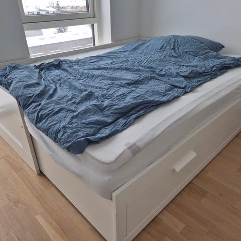 Selling BRIMNES bed, mattress, and top mattress, bought brand new from Ikea in 2022. Bed comes with 4 large drawers for storage. From a smoke free house. Brand new everything costs 4000kr.