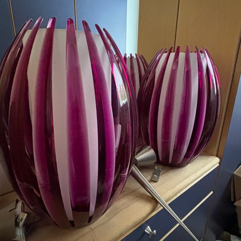 Lumalano, to loftslamper fra hollandsk designer i farverne sart rosa og pistacie. Lamperne er i filtet uld som filtrerer lyset på en skøn, naturlig måde. Flotte porcelænsfatninger og snoet ledning i naturhår. Havde længe ønsket mig dem, men kunne desværre ikke fundet en plads til dem her hos os, så nu må de videre! Nypris 1500 for de to