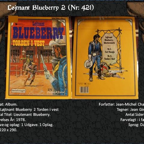 Marshal Blueberry 1: Efter ordre fra Washington, Jean Giraud, Tegneserie, Western tegneserie i farve. Tegnet af: William Vance. Blueberry bliver "headhunted" til en opgave, hvor han skal afsløre en våbensmuglerbande. Våbensmuglerne viser sig at have forbindelse til Fort Navajo, hvor Blueberry gør tjeneste.