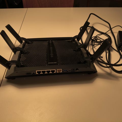 Netgear AX1800 WiFi 6 router. Trådløs router med WiFi 6-teknologi (802.11ax) egnet til hjemmenetværk og mindre kontorer. Modellen understøtter dual-band WiFi og er designet til at håndtere flere enheder samtidig. Routeren har eksterne antenner for bedre dækning samt flere LAN-porte til kablede forbindelser. Velegnet til almindelig internetbrug, streaming og online gaming afhængigt af internetforbindelsen.