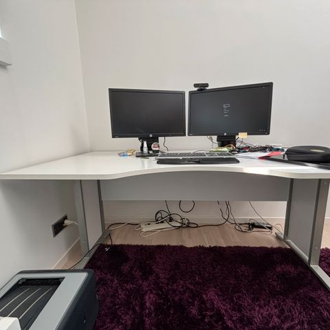 Skrivebord i hvidt med rektangulær bordplade og afrundede hjørner. Bordet har to ben og en kabelbakke monteret under bordpladen til organisering af ledninger. Egnet som arbejdsbord eller computerbord i kontor eller hjemmemiljø. Materiale fremstår som laminat eller lignende glat overflade, som er let at rengøre. Størrelsen passer til opsætning med flere skærme og stationær computer.