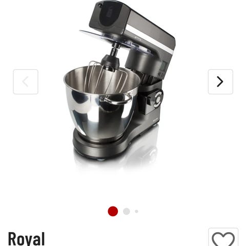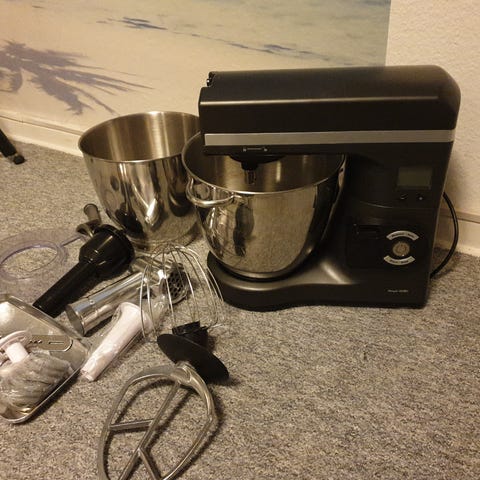 Royal 1800 Deluxe køkkenmaskine med røreskål i rustfrit stål. Maskinen har digitalt display og betjeningsknapper på fronten. Medfølgende tilbehør omfatter blandt andet piskeris og dejkrog, som egner sig til æltning, piskning og blanding af forskellige typer dej og ingredienser. Køkkenmaskinen er velegnet til almindelige køkkenopgaver som bagning og madlavning i hjemmet. Kun brugt få gange