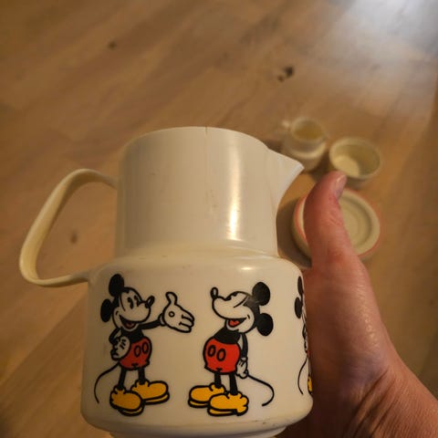 Vintage Mickey Mouse termoflaske fra 1987 i rød og hvid plastik. Flasken har motiv af Mickey Mouse på siden og rødt skruelåg, der også kan bruges som kop. Indvendigt isoleret indsats til at holde drikke varme eller kolde.