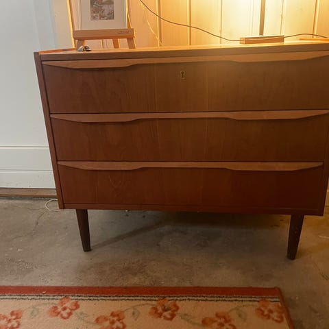 Kommode i teaktræ med tre skuffer. Skufferne har integrerede greb i fronten, og møblet står på runde ben. Velegnet som opbevaringsmøbel i stue, soveværelse eller entré. Overfladen fremstår med synlig træstruktur i teaklook.