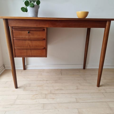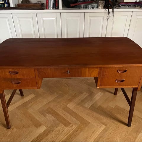 Skrivebord i teak fra Domino møbler med fine skuffer og kantede ben. Et velholdt bord uden tydelige brugsspor som lige har fået olie.