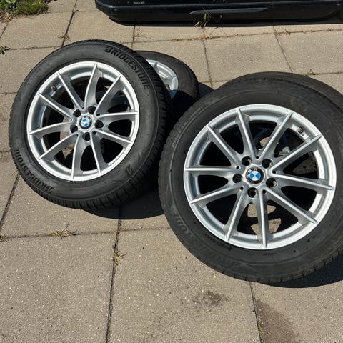 Sæt med 4 originale BMW alufælge med vinterdæk, stadigvæk fornuftigt mønster dybde. Kommer fra en 520D touring fra 2012. Fast pris.