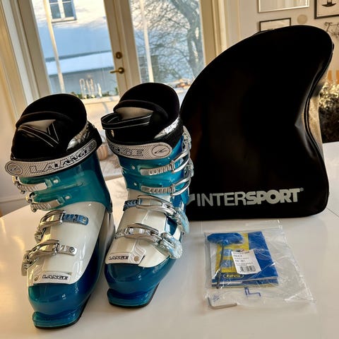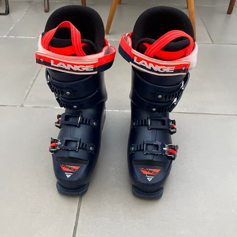 Lange Comp 100 klassiske ski støvler i størrelse 41. Modellen er en medium pasform med justerbart spændesystem. Farven er blå med røde og sølvfarvede spænder. Velegnet som alpinske skistøvler til brug med standard skibindinger.