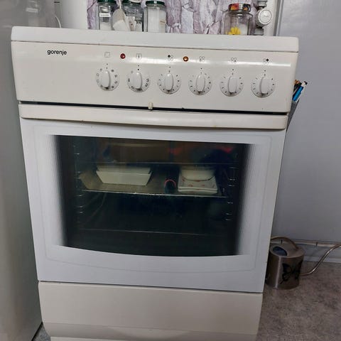 Gorenje kogeplade komfur med ovn i hvid. Komfuret har fire traditionelle elektriske kogeplader på toppen og integreret ovn med glaslåge.