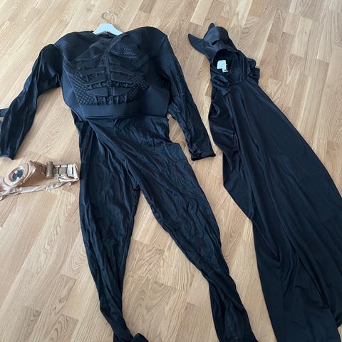 Batman kostume unisex i sort. Str.5-7 år. Dragten består af heldragt med lange ærmer og ben, påtrykt Batman-logo på brystet samt gul bælte-detalje. Medfølgende sort kappe og sort Batman-maske. Egnet som udklædning til børn afhængigt af størrelse, f.eks. til fastelavn, temafester eller leg derhjemme.