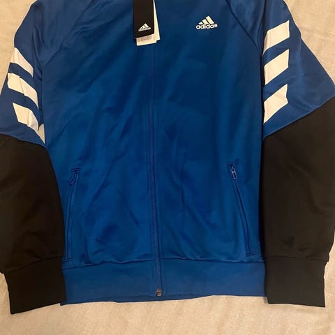 Adidas fodboldtræningsjakke til mænd i størrelse M. Jakken er rød med gennemgående lynlås på fronten og har lange ærmer med de karakteristiske Adidas-striber på underarmene. Foran ses klub- eller holdlogo samt sponsortryk, og på ryggen er der yderligere sponsortryk. Materialet er let og egnet til fodboldtræning og opvarmning. Velegnet som træningsjakke eller overtræksjakke til fodbold.