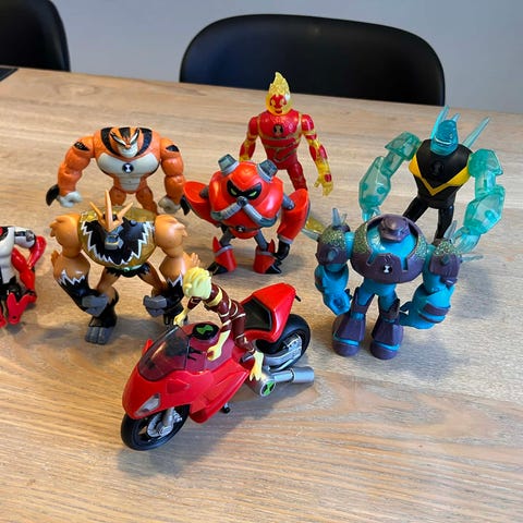Ben 10 sæt med legetøjsfigurer og køretøjer. Sættet indeholder flere actionfigurer samt en rød motorcykel og et rødt rumfartøj/fly med flamme-detaljer. Egnet til leg med action- og fantasitema. Velegnet til børn, der kan lide figurer, køretøjer og rollespilsleg.