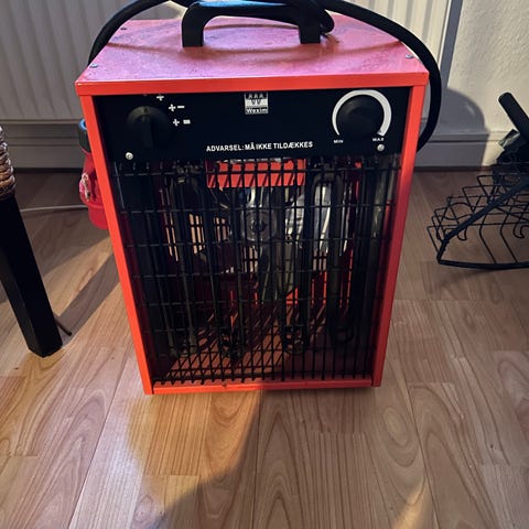 En blå elektrisk varmeblæser med en effekt på 2 kW. Den fungerer på 230/240 V, 50 Hz og har en IP24-beskyttelsesklasse. Velegnet til brug som elektrisk varmeovn i små rum, værksteder eller garager, der kræver midlertidig opvarmning.
