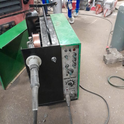 Brugt Migatronic 300 Compagt Co2 svejser, hvor der er fejl ved tråd fremføring der medfølger tom 6 kg. kuldioxid flaske (Co2) og svejsehjelm
