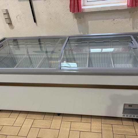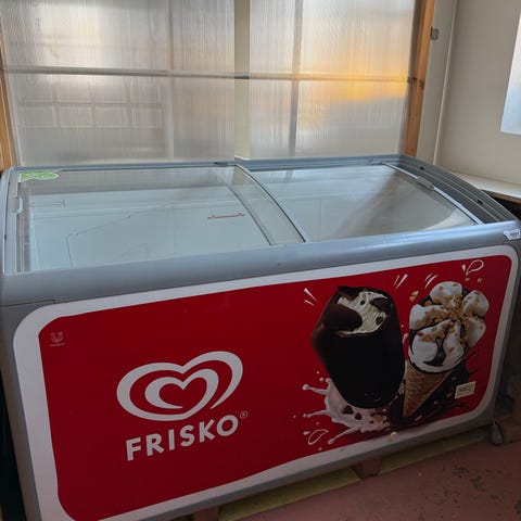 Frisko kummefryser med glaslåger i rød farve. Fryseren har skydelåger i glas, som giver overblik over indholdet. Velegnet til opbevaring og præsentation af is og andre frostvarer i butik, kiosk eller lignende erhvervsmiljøer. Udvendigt Frisko-design på siderne.