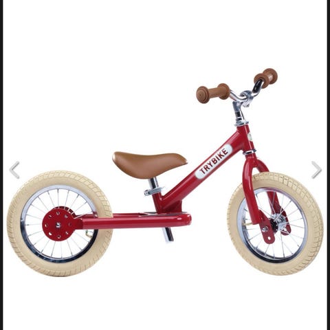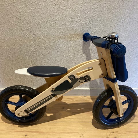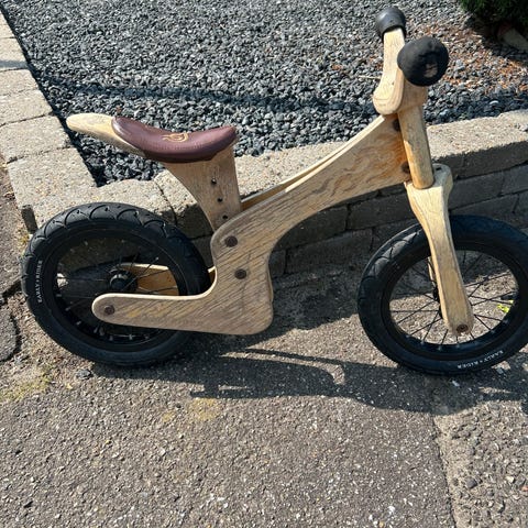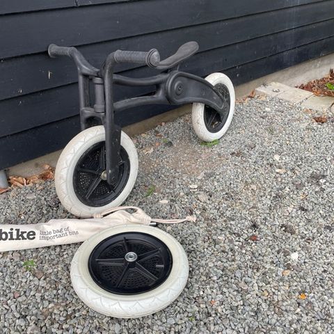 Wishbone 3-in-1 løbecykel i træ med hvide dæk. Cyklen kan samles både som trehjulet og tohjulet balancecykel, så den kan tilpasses barnets udviklingstrin. Stellet er i lyst træ med sort sæde og sorte hjul med hvide dæk. Velegnet som balancecykel til mindre børn, der skal øve motorik og balance. Købspris 1400 dkk.