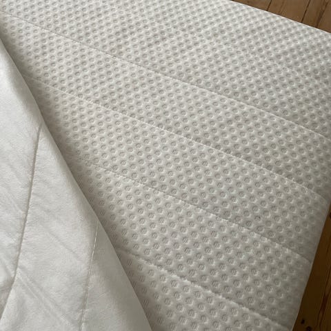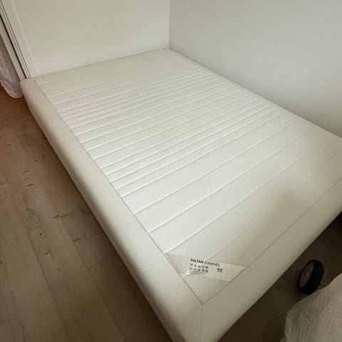 IKEA Sultan Sigsig madras i hvid. 140x200 Madrassen har quiltet overflade med lige, gennemgående syninger, som giver en jævn liggeflade. Betrækket er lyst og glat med tekstilstruktur. På billederne ses både madrassen og en løs 6 cm tyk topmadras ovenpå.