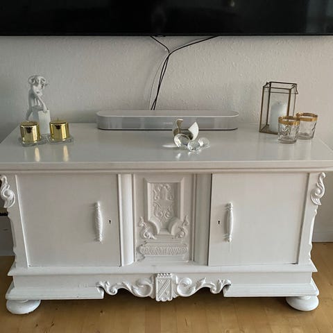 Smuk hvid romantisk skænk med fine udskæringer. B 92 D 47 H 87.