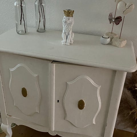 Smuk hvid romantisk skænk med fine udskæringer og i massiv træ malet både ude og indvendig. B 134 D 50 H 70