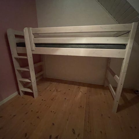 Højseng til børn. Madrassen er 160 x 70 cm. Sengen er udført i en lys farve med stige i den ene ende. Under sengen er der som vist plads til f.eks skrivebord. Velegnet til børneværelse, hvor der ønskes kombination af soveplads og arbejds-/legeplads.