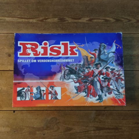 Hasbro Risk brætspil. Strategispil hvor spillerne konkurrerer om verdensherredømmet ved hjælp af hære og territorier på spillepladen. Sættet omfatter spilleplade, plastikfigurer i flere farver, kort og regler. Egnet til flere spillere og typisk til familie- og strategispilsaftener.