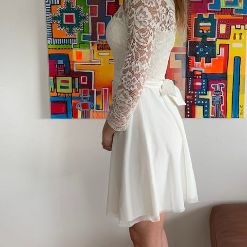 Konfirmations kjole til særlige lejligheder i hvid polyester, one size. Kjolen har blondeoverdel med rund hals og lange ærmer i gennemsigtigt blondestof. Overdelen er figursyet med indvævede blondeapplikationer og markeret barm. Nederdelen er glat og let A-formet med faldende skørt. På ryggen er der åbent parti med blondedetaljer og lukning bagtil. Egnet til brug ved særlige lejligheder som fester eller formelle begivenheder.