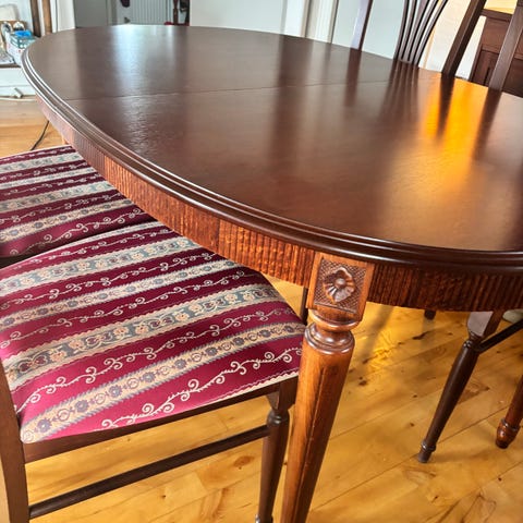 Spisebord med to plader og seks stole