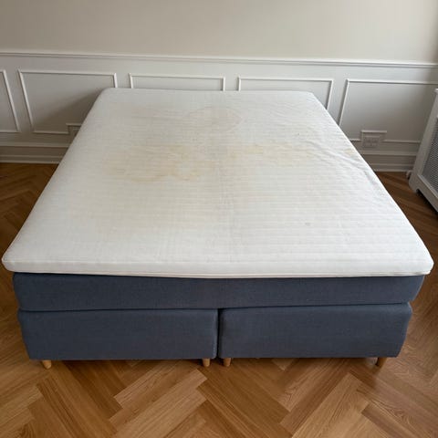 Der er en lille svag skjold på topmadrassen efter en juice-plet. Den er forsøgt renset og fremstår kun som en kosmetisk detalje.