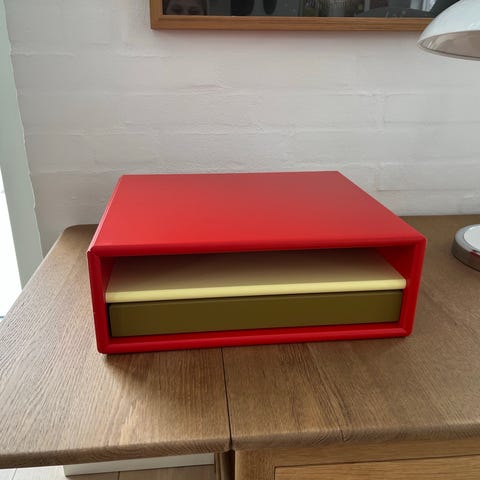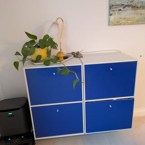 Montana skuffemodul reol med skuffer i cremefarvet / perlemor .. med smalle skuffer øverst samt et åbent rum nederst til opbevaring. Der er huller til ledninger… se foto…Velegnet som lille reol- eller vægmodul til kontor, stue eller kreativt værksted, hvor der er behov for organiseret opbevaring af krea-ting..