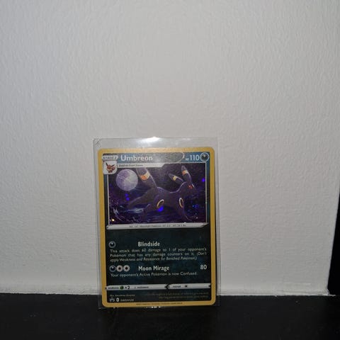 Pokémon Umbreon samlekort fra Pokémon Trading Card Game. Kortet viser Umbreon med angrebene Blindside og Moon Mirage. Standard størrelse Pokémon-kort med gul kant og illustrationsmotiv på forsiden samt klassisk Pokémon-bagside. Velegnet til samling eller spil i Pokémon TCG.