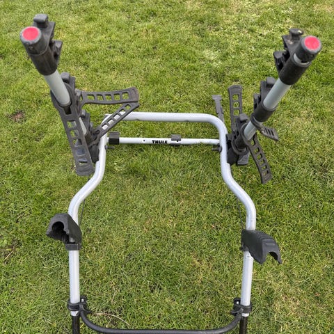 Thule ClipOn cykelholder til bagklap. Model 9103 til montering på bilens bagklap med justerbar aluminiumsramme og polstrede holdere til cyklerne. Medfølgende remme og kroge til fastgørelse på bilen samt nummerpladeholder. Leveres med instruktionsmanual til korrekt montering og brug.