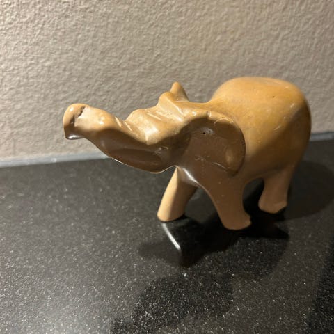 Dekorativ elefant figur i udskåret sæbe sten. Figuren forestiller en stående elefant med gennembrudt mønster på kroppen, hvor der er udskåret huller og detaljerede ornamenter med en baby elefant inde i maven. Overfladen har en naturstensfarve i grønne og beige nuancer. Velegnet som lille pyntegenstand i hjemmet, f.eks. på hylde, reol eller vindueskarm.