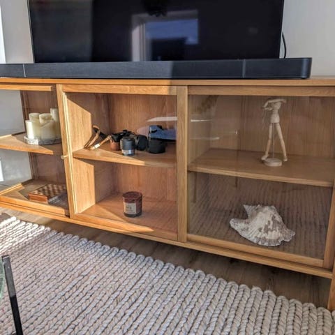 Skænk i træ med sort front og lys træramme. Møblet står på ben i træ og har tre låger i venstre side samt tre skuffer i højre side. Overfladen kan bruges til opbevaring og dekoration i stue, spisestue eller entré. Velegnet til opbevaring af service, tekstiler eller andre ting, der ønskes gemt af vejen bag låger og i skuffer. 2 år gammel. Nypris ca 15.000 kr. Olieret eg. H: 75 cm B; 175 cm D: 45 cm
