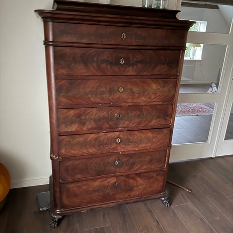 Høj kommode, Louis XV-stil, i fineret træ med intarsia, blomster- og slyngemotiver, på alle skuffer. Kommoden har 6 skuffer, originale messingbeslag, buet front og og slanke ben med messingfødder. Egnet til opbevaring i stue, soveværelse eller entré. Overfladen fremstår med blank finish og klassisk udtryk.