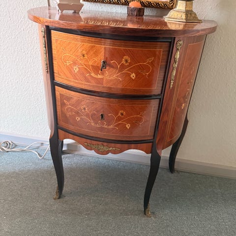 Høj kommode med 6 skuffer i træ med intarsia