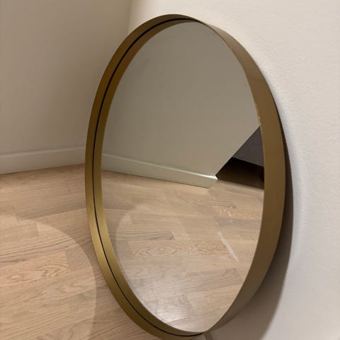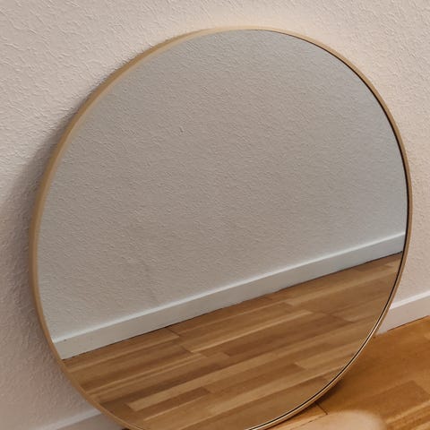 Rundt spejl med guldramme i Ø70 sælges. Spejlet har ikke været brugt men blot hængt i et gæsteværelse. Sælges grundet flytning.