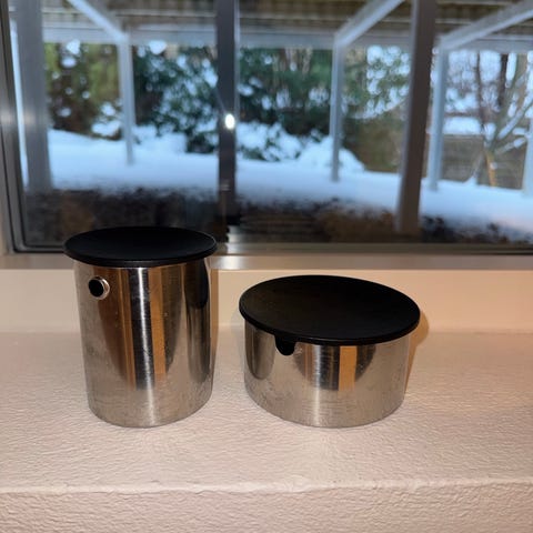 Stelton kaffekande, vandkande, fløde og sukkerskål i rustfrit stål. Kaffekanden mangler låg.