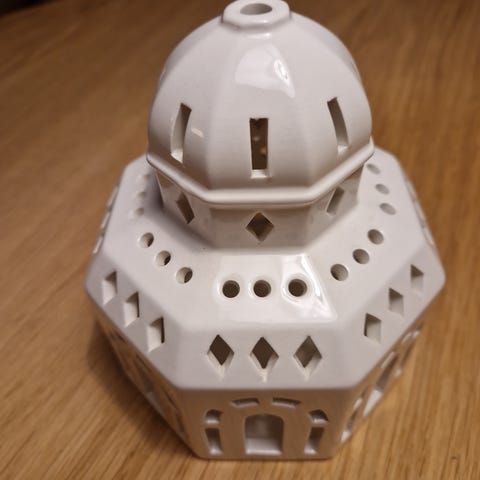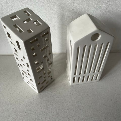 Kähler Urbania Tivoli lyshuse i hvidt porcelæn. Serien består af forskellige bygninger fra Tivoli, udført som dekorative lyshuse til fyrfadslys. Lyshusene er velegnede som indendørs pynt på fx vindueskarm, hylde eller bord og kan bruges enkeltvis eller samlet som en lille by. Designet er detaljeret med udskæringer, der lader lyset skinne igennem porcelænet.
