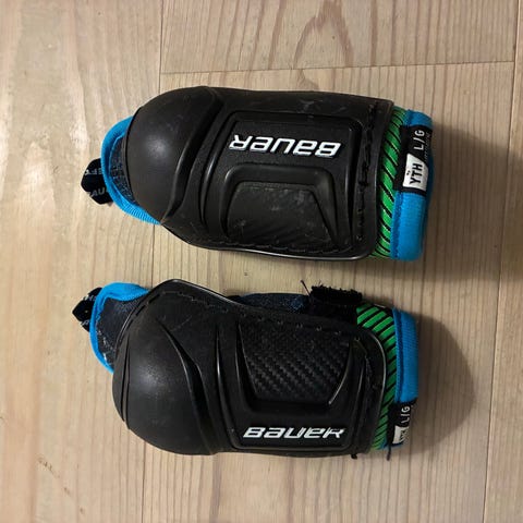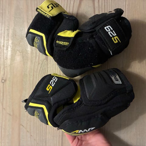 Bauer ishockey albuebeskyttere i hvid og sort med gul inderside. Beskytterne har justerbare stropper med velcro for fastgørelse om armen. Velegnet til brug ved ishockey for at beskytte albuer mod slag og stød under spil og træning. Passer til 5-8 årige
