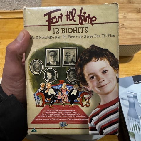 Far til fire dvd film samling med flere titler fra serien, herunder blandt andet "Far til fire på japansk", "Far til fire gir aldrig op", "Far til fire på hjemmebane" og "Far til fire i stor stil". Fysiske dvd-udgaver med dansk familiefilm velegnet til hjemmebrug i dvd-afspiller. Flere af udgaverne har farverige omslag med motiver af familien og elefanten.