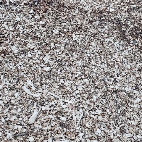 Træflis hugget af birk og nåletræ. Flot og lyst flis til haven.