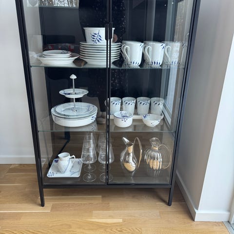 Helt nyt vitrineskab Mossjön IKEA. Købt efteråret 2025 til 1000kr. Der har kun ligget håndklæder i skabet.