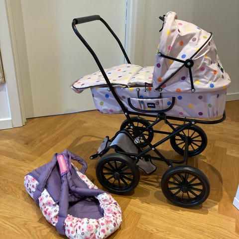 BRIO dukkevogn i lilla stof med mønstret inderfor. Vognen har metalstel, fire hjul og justerbart håndtag. Egnet til leg med dukker og bamser indendørs og udendørs.
