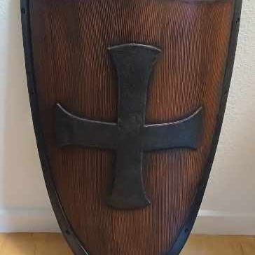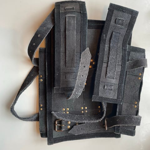 LARP udstyr sæt bestående af rundt skjold, sværd og flere dele rustning i læder eller læderlignende materiale. Sættet omfatter blandt andet brystplade med remme, underarmsbeskyttere og bælter samt mindre dele til fastgørelse. Udstyret er velegnet til rollespil, kostume eller rekvisitbrug og er designet til at efterligne middelalderligt kampudstyr uden skarpe kanter.