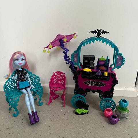 Monster High dukke med langt turkis hår og detaljeret outfit i turkis og guld. Sættet indeholder en lilla Monster High bil med sorte og sølvfarvede detaljer samt tilbehør i form af børster/kamme og dukkeholder. Egnet som rolleleg og samlerobjekt for børn, der kan lide Monster High universet.