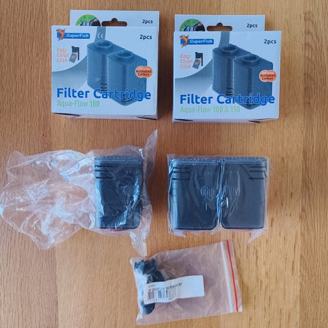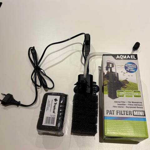 Aquael miniboost 100 luftpumpe, elefantfod filter, luftslange og returventil.
