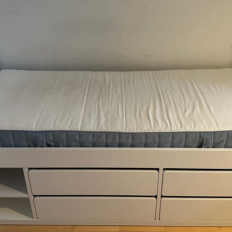 Købt maj 2025. Har kvittering på seng og madras. IKEA SLÄKT sengestel med underseng og opbevaring i hvid. Sengen består af en enkeltseng med tilhørende udtræksseng/underseng samt integrerede skuffer til opbevaring. Konstruktionen er i hvidt stel med glatte fronter. Velegnet som juniorseng eller til værelse, hvor der er behov for ekstra soveplads og opbevaringsplads under sengen.