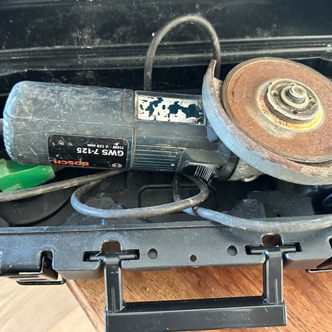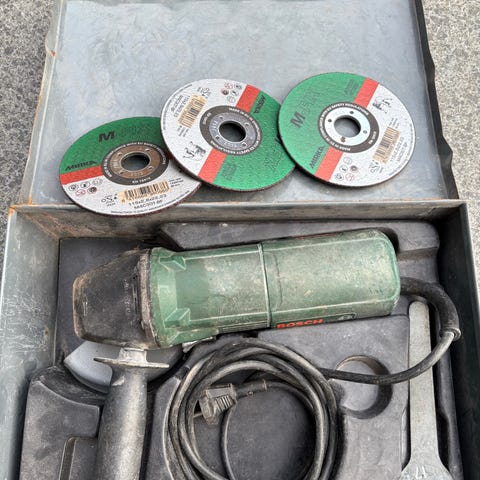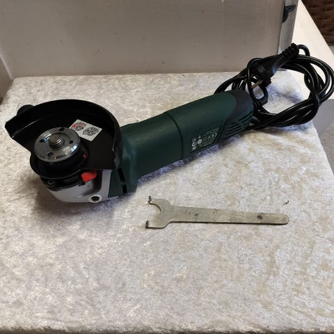Bosch PWS 550 vinkelsliber med sidehåndtag og metal-kuffert. El-drevet model egnet til skære- og slibeopgaver i fx metal og sten, afhængigt af monteret skive. Leveres med tilbehør som vist på billederne, herunder forskellige skiver og monteringsdele i kufferten.