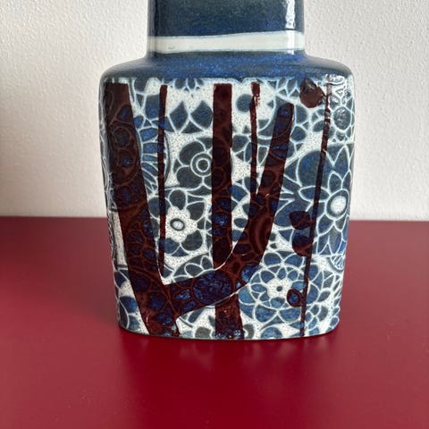 Royal copenhagen vase i firkantet form. Vasen er udført i keramik med glaseret overflade og dekoreret med blå og hvide mønstre på siderne. Højden er ca. 12,5 cm, som vist på billedet med lineal. Velegnet som mindre bordvase eller som dekorativt element i indretningen.