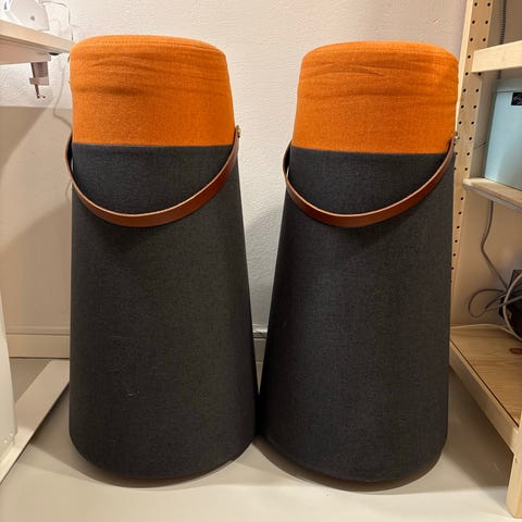 Benesit taburet i gråt tekstil med brun læderhank. Taburetten har en rund siddeflade og konisk form, der giver stabilitet. Undersiden er udført med korkbelægning. Egnet som ekstra siddeplads eller som fleksibel arbejds- og balancestol i hjem eller kontor.